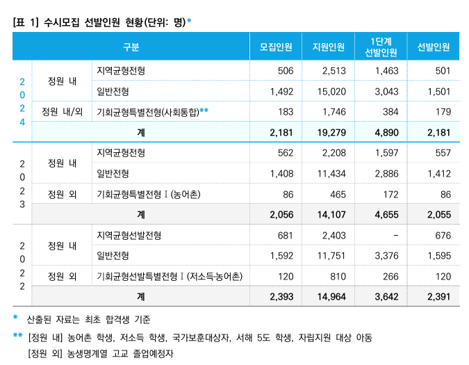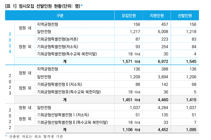 정시의 5개 전형의 인원모집을 참고할 수 있다.